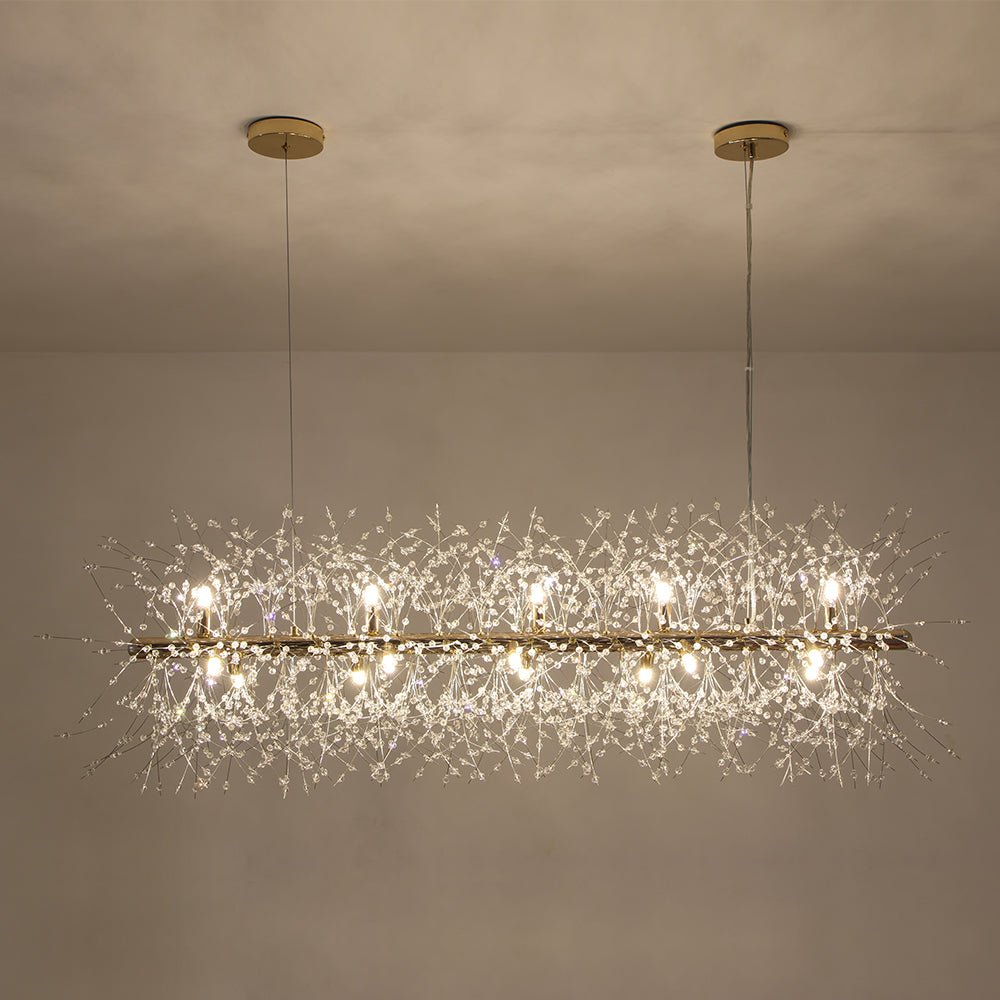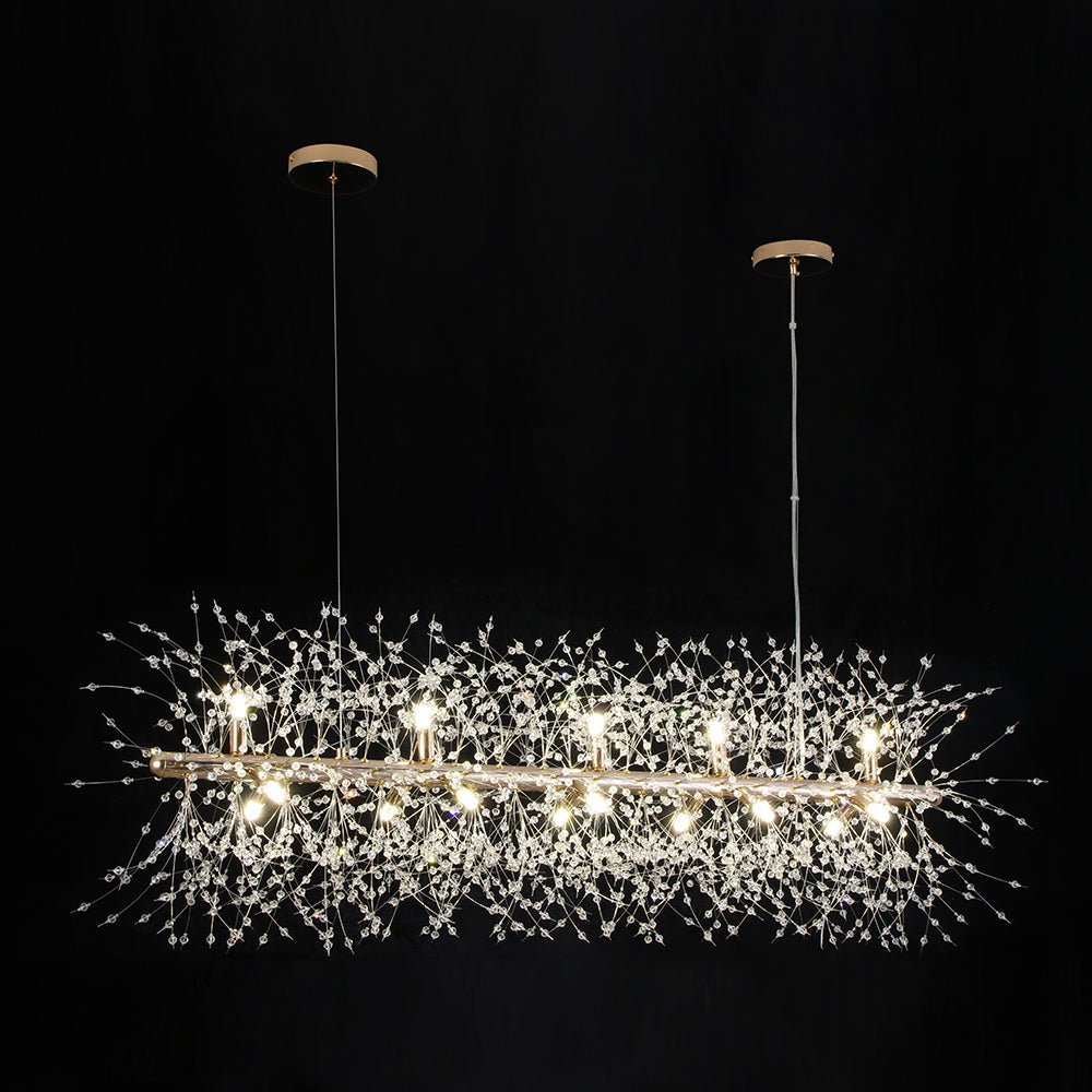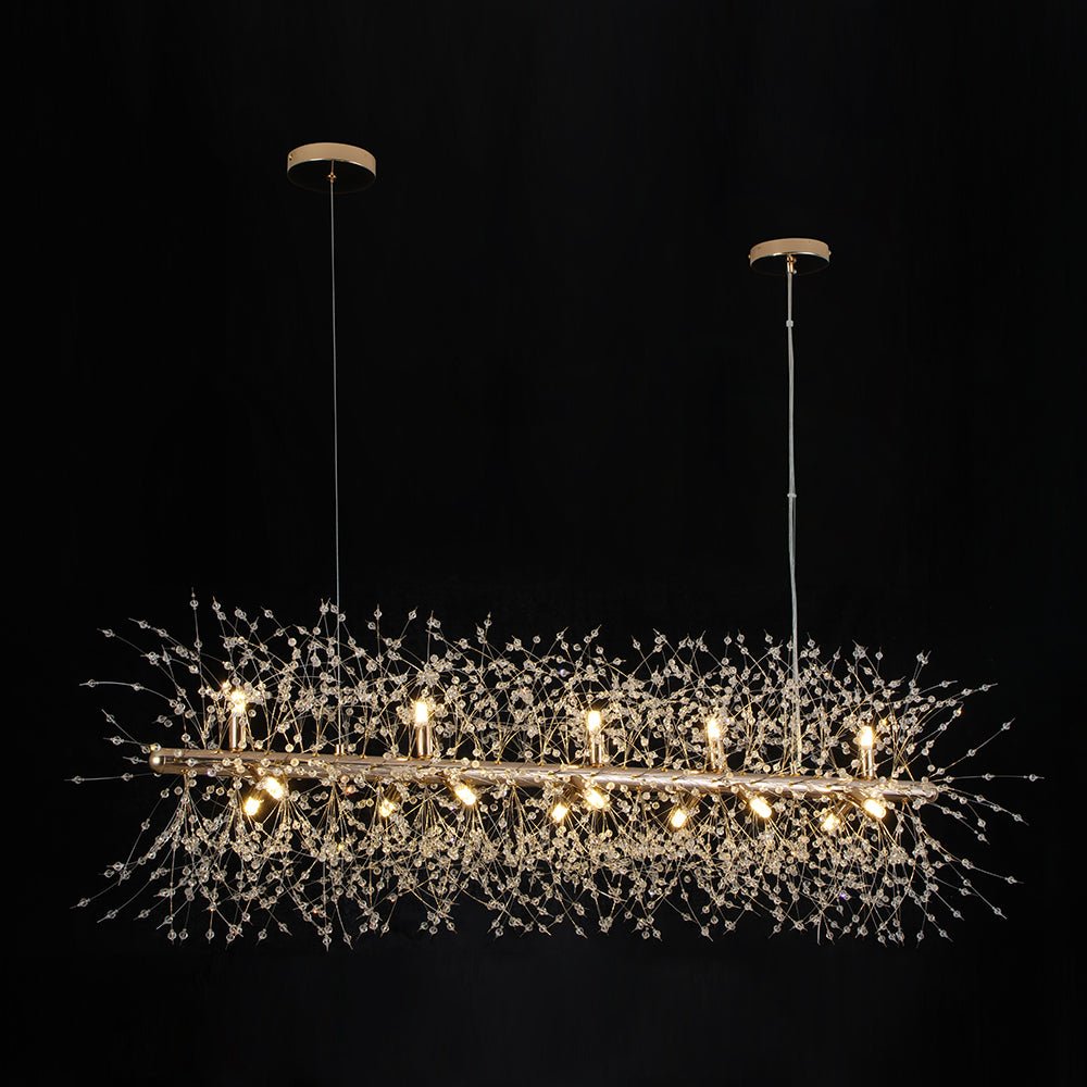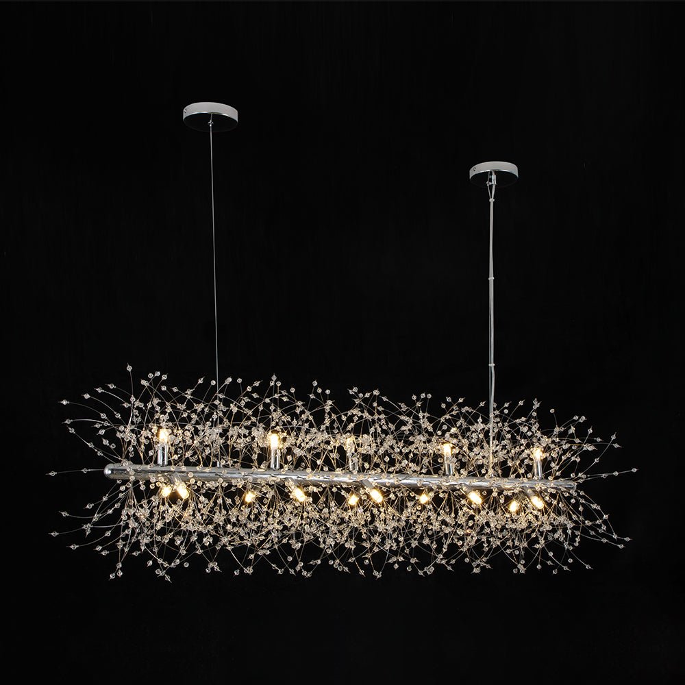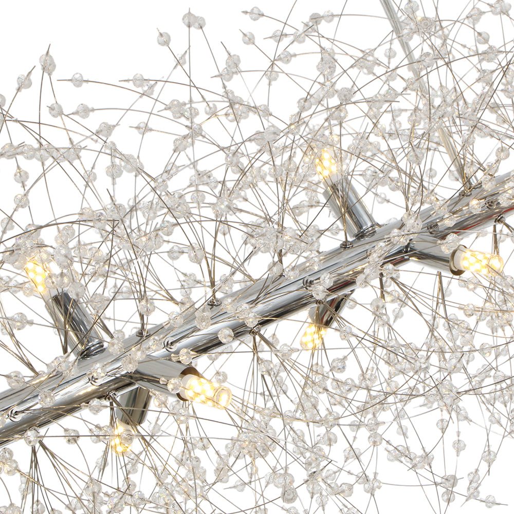 Moderner, glamouröser, linearer Kronleuchter aus Kristallglas mit 15 Leuchten im Sternen- und Löwenzahn-Design.