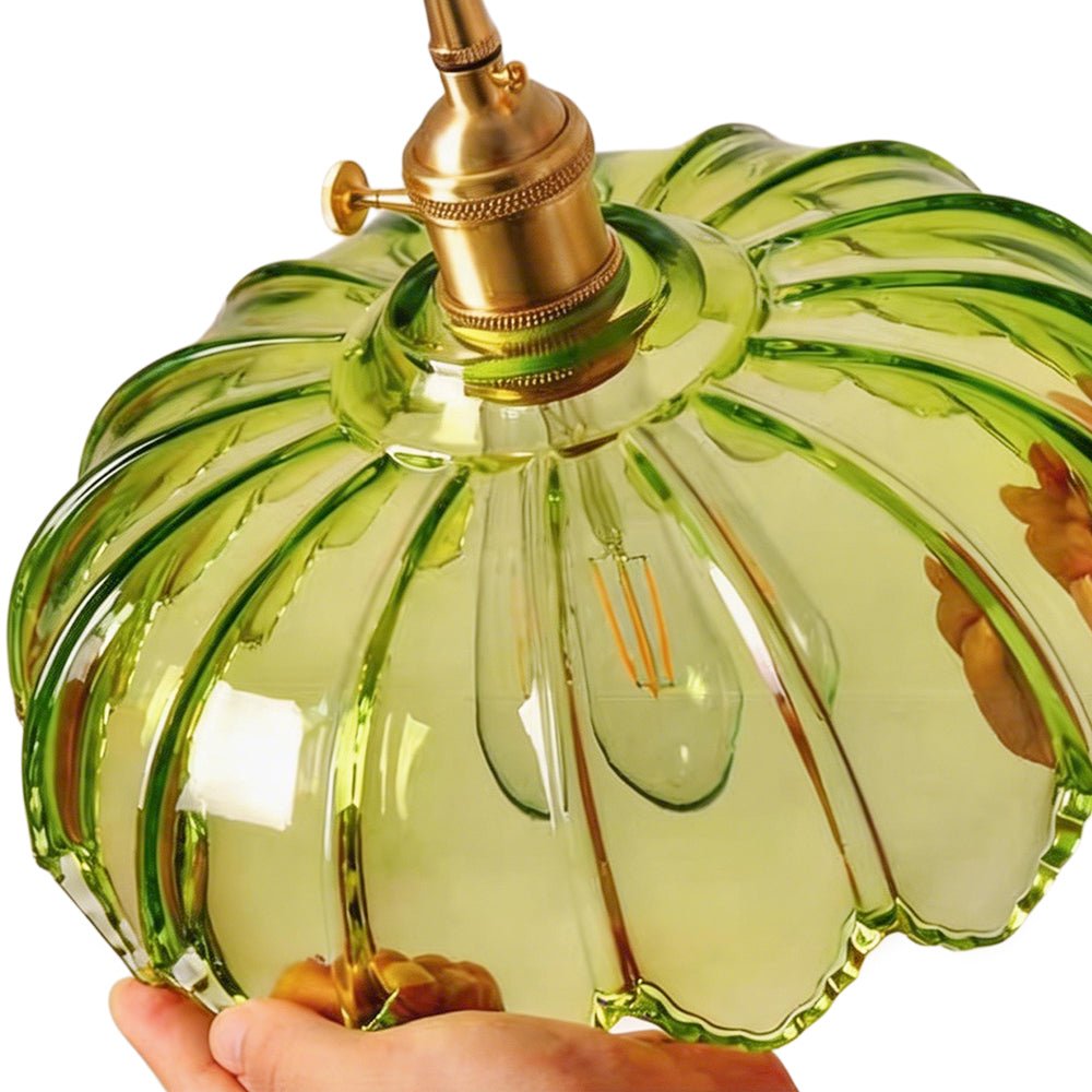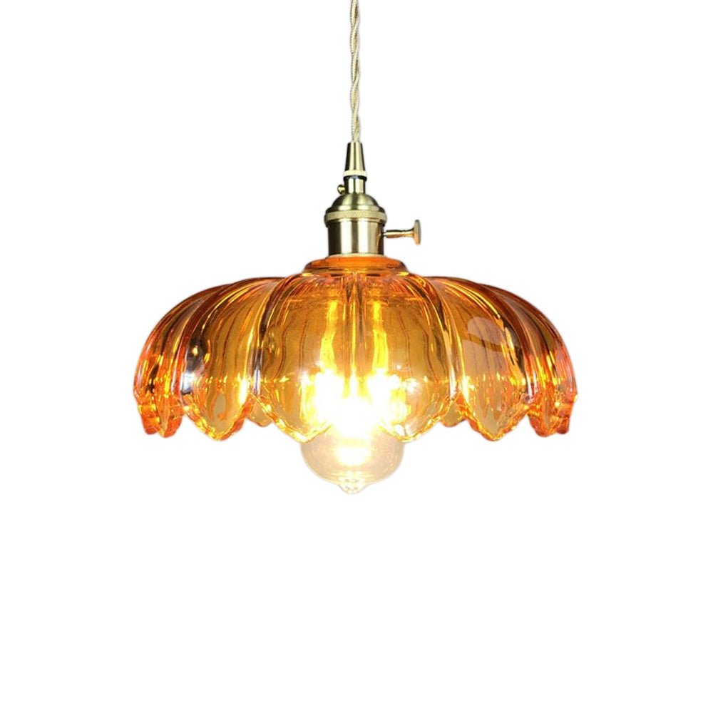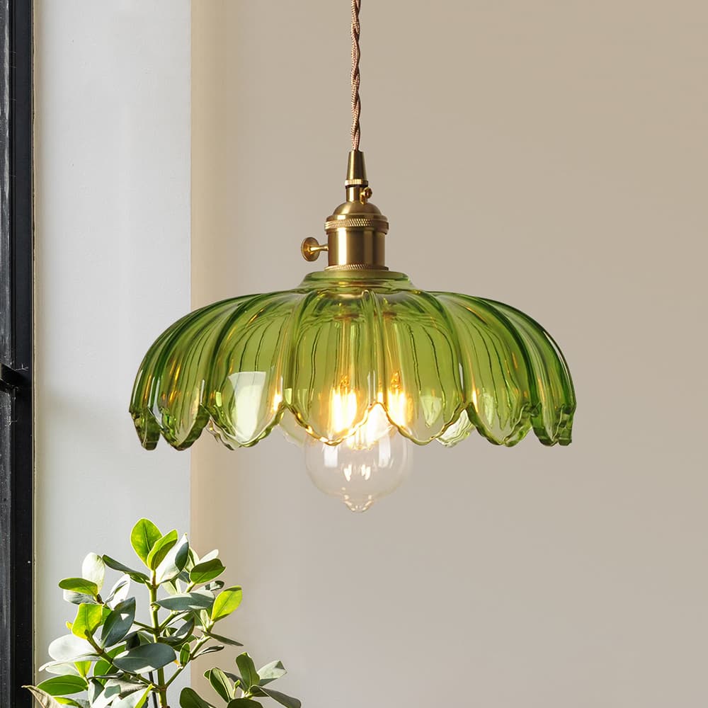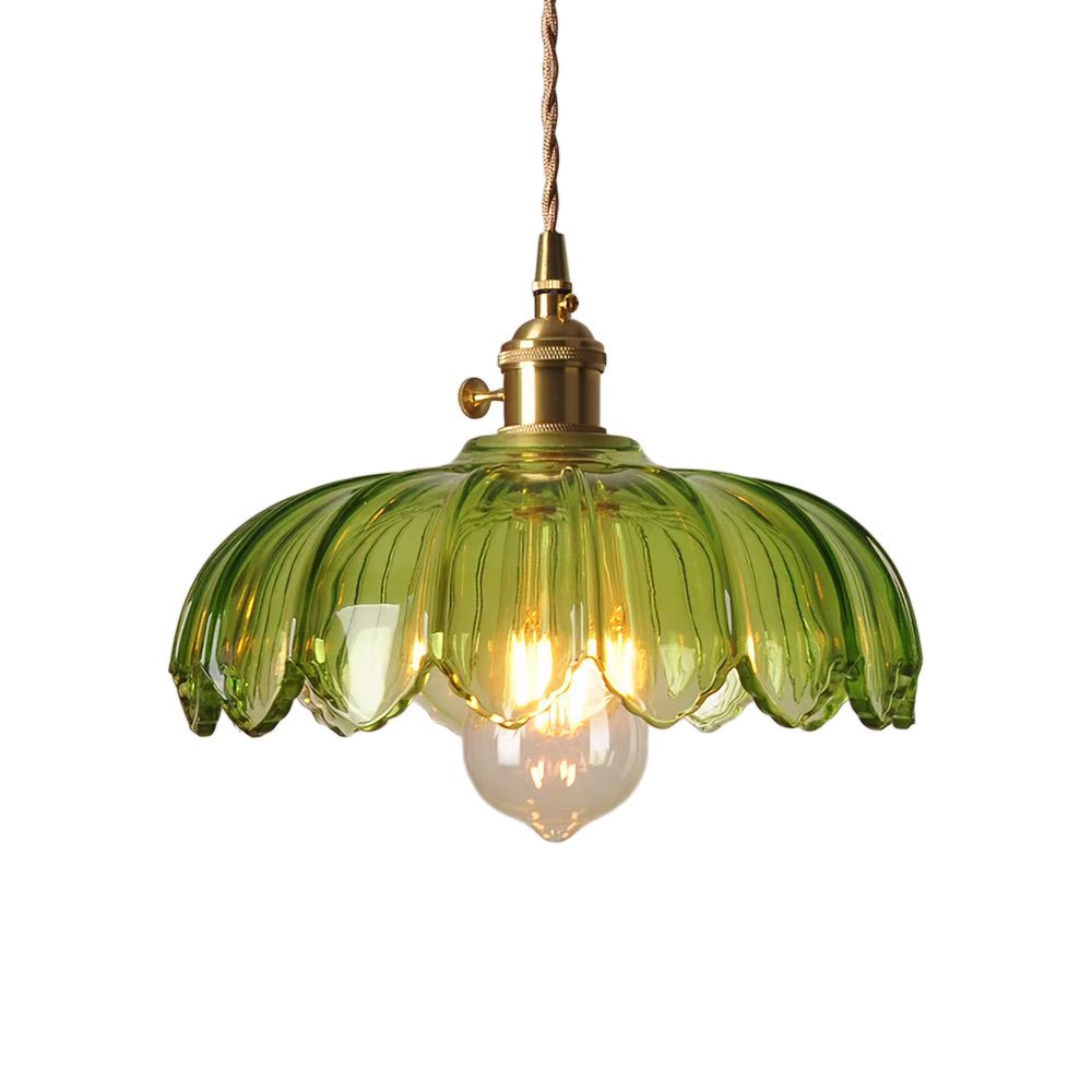 Verleihen Sie Ihrem Raum mit dieser einflammigen Pendelleuchte einen zeitlosen Mid-Century-Vintage-Charme. Eine atemberaubende Mischung aus Kunstglas und hochwertigen Messingbeschlägen. Der Glasschirm in Form eines skulpturalen Lotusblütenblattes mit vertikaler Rippenstruktur und gekräuselten Blütenblattkanten ist in warmem Bernstein oder frischem Grasgrün erhältlich. Die Messingbeschläge verleihen einen warmen, raffinierten Retro-Touch, während das geflochtene Baumwoll-Aufhängekabel eine verstellbare Höhe bietet, um verschiedenen Deckenhöhen gerecht zu werden. Die Bernsteinvariante liefert ein gemütliches, heilendes, warmes gelbes Leuchten, und die grasgrüne Option bietet eine frische, sanfte, warme grüne Beleuchtung, die beide eine romantische, nostalgische Retro-Atmosphäre schaffen. Perfekt für Essbereiche, Eingangsbereiche, Bars, Balkone und Nachttische, ergänzt diese vielseitige Leuchte nahtlos französische Vintage-, Mid-Century-, amerikanische Landhaus- und Cottage-Stileinrichtungen sowie gewerbliche Räume wie Homestays und Cafés.