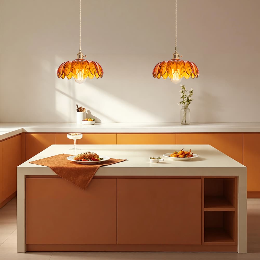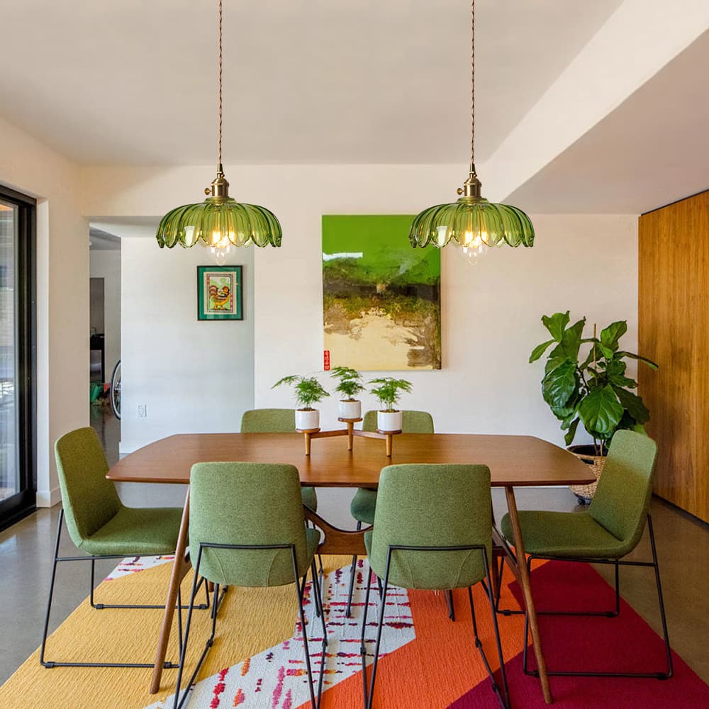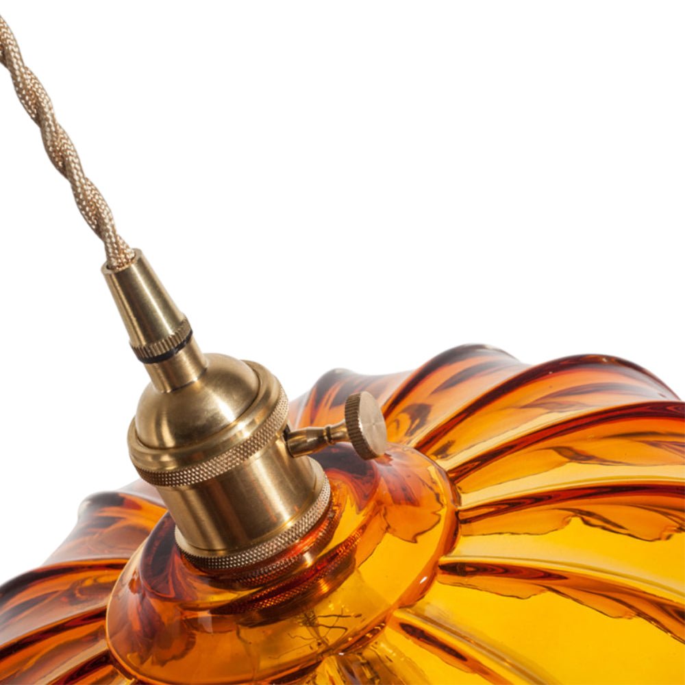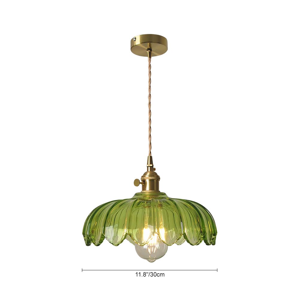 Verleihen Sie Ihrem Raum mit dieser einflammigen Pendelleuchte einen zeitlosen Mid-Century-Vintage-Charme. Eine atemberaubende Mischung aus Kunstglas und hochwertigen Messingbeschlägen. Der Glasschirm in Form eines skulpturalen Lotusblütenblattes mit vertikaler Rippenstruktur und gekräuselten Blütenblattkanten ist in warmem Bernstein oder frischem Grasgrün erhältlich. Die Messingbeschläge verleihen einen warmen, raffinierten Retro-Touch, während das geflochtene Baumwoll-Aufhängekabel eine verstellbare Höhe bietet, um verschiedenen Deckenhöhen gerecht zu werden. Die Bernsteinvariante liefert ein gemütliches, heilendes, warmes gelbes Leuchten, und die grasgrüne Option bietet eine frische, sanfte, warme grüne Beleuchtung, die beide eine romantische, nostalgische Retro-Atmosphäre schaffen. Perfekt für Essbereiche, Eingangsbereiche, Bars, Balkone und Nachttische, ergänzt diese vielseitige Leuchte nahtlos französische Vintage-, Mid-Century-, amerikanische Landhaus- und Cottage-Stileinrichtungen sowie gewerbliche Räume wie Homestays und Cafés.