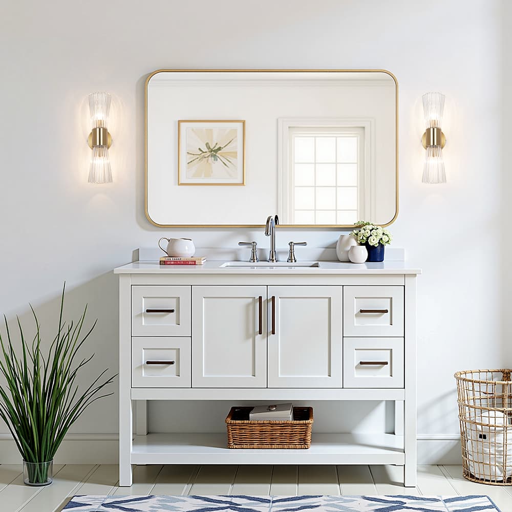 Diese moderne doppelt-konische 2-flammige Wandleuchte wertet jedes Interieur mit schlankem, minimalistischem Luxus auf. Sie zeichnet sich durch ein symmetrisches Design aus edlem, naturfarbenem Messing und geripptem Klarglas aus. Ihre zwei umgedrehten konischen Glasschirme, verbunden durch einen zentralen Metallring, sind mit einer vertikal gerippten Textur gefertigt, die beim Einschalten zarte wellenartige Lichtmuster an die umgebenden Wände wirft und ein nach oben und unten gerichtetes Licht streut, das für eine geschichtete Umgebungsbeleuchtung sorgt. Die kompakten Abmessungen machen sie perfekt für die Akzentbeleuchtung an Schlafzimmerkopfteilen, Akzentwänden im Wohnzimmer, in Eingangsbereichen, Fluren, Badezimmerwaschtischen sowie in Ferienwohnungen, Luxushotels, Cafés und anderen gewerblichen Räumen. Sie dient als stilvoller Blickfang, der die Raumgestaltung aufwertet. Sie lässt sich mühelos mit modernen, luxuriösen, nordischen und minimalistischen Interieurs kombinieren.