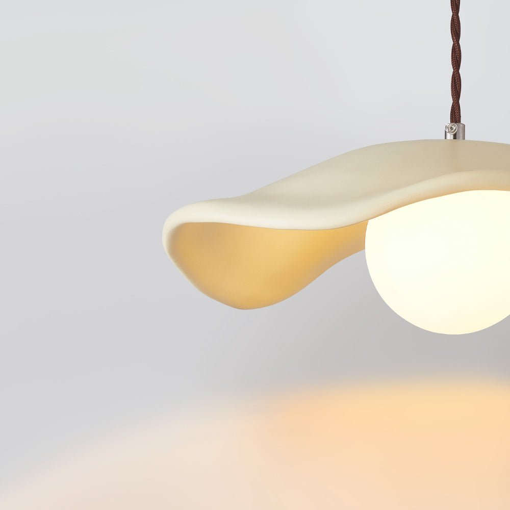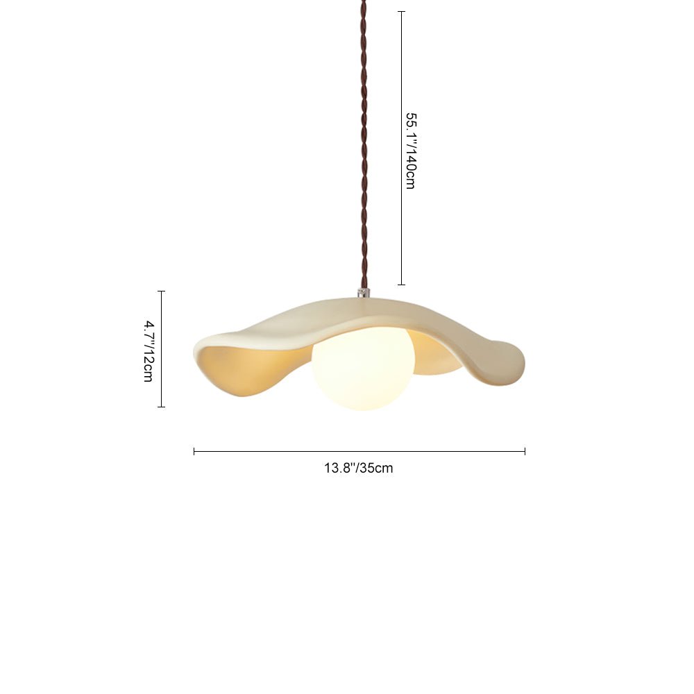 This farmhouse pendant light combines modern minimalism and naturalism, with the rustic charm of wabi-sabi style. It creates a warm and artistic spatial atmosphere with soft lines, serving as an artistic lamp to enhance the home's style. The creamy-white resin lampshade has a naturally stretching form, as agile and elegant as a lotus leaf swaying in the wind. It is matched with a milk-white glass ball, which has a warm and soft texture. The two-core brown twisted suspension wire is tightly woven and durable, adding a touch of retro and elegance. The overall shape is chic and rich in layers, with a strong sense of visual focus. Ideal for living rooms, dining rooms, bedrooms, studies, bar counters, cafes, restaurants, art galleries, log cabins, homestays, or hotels.