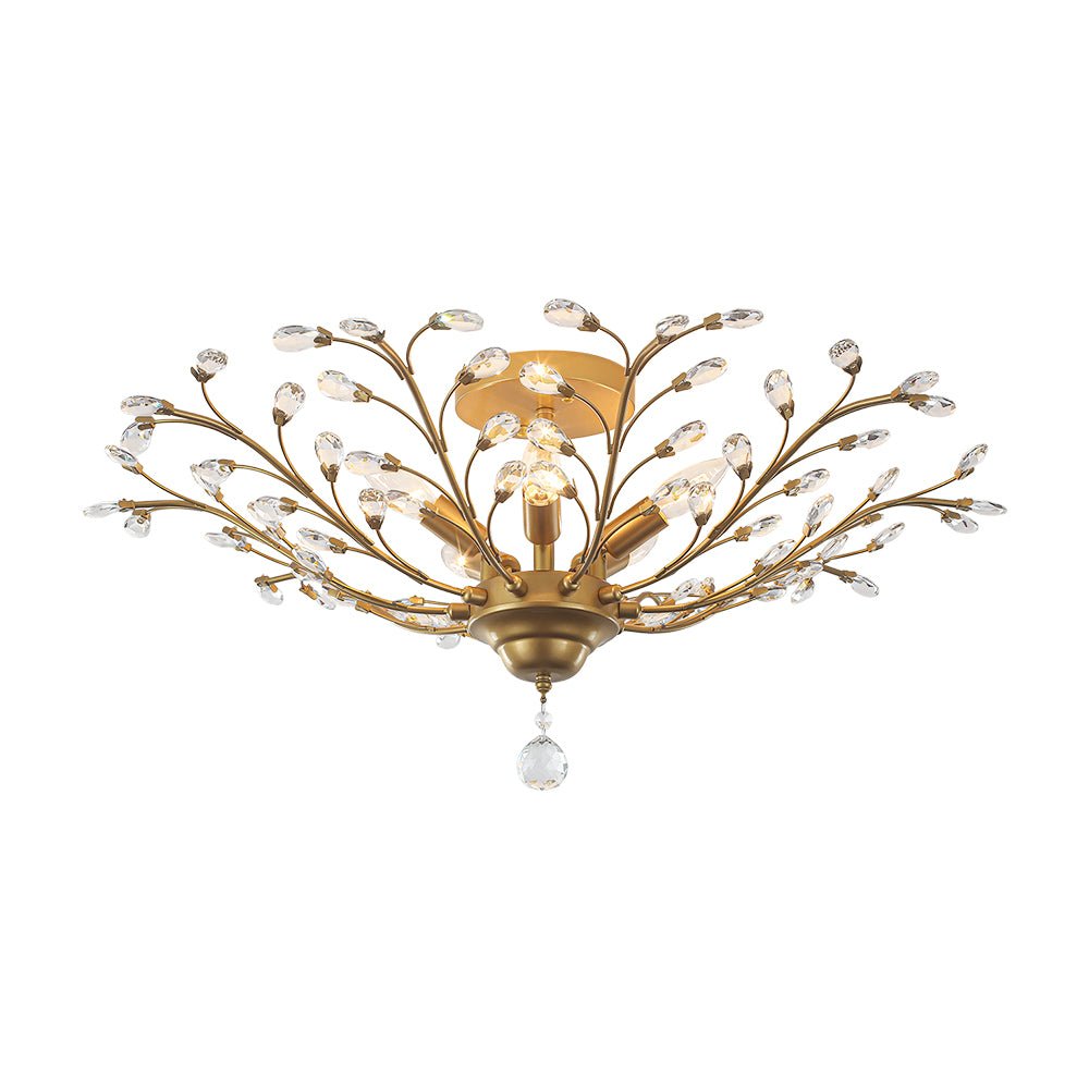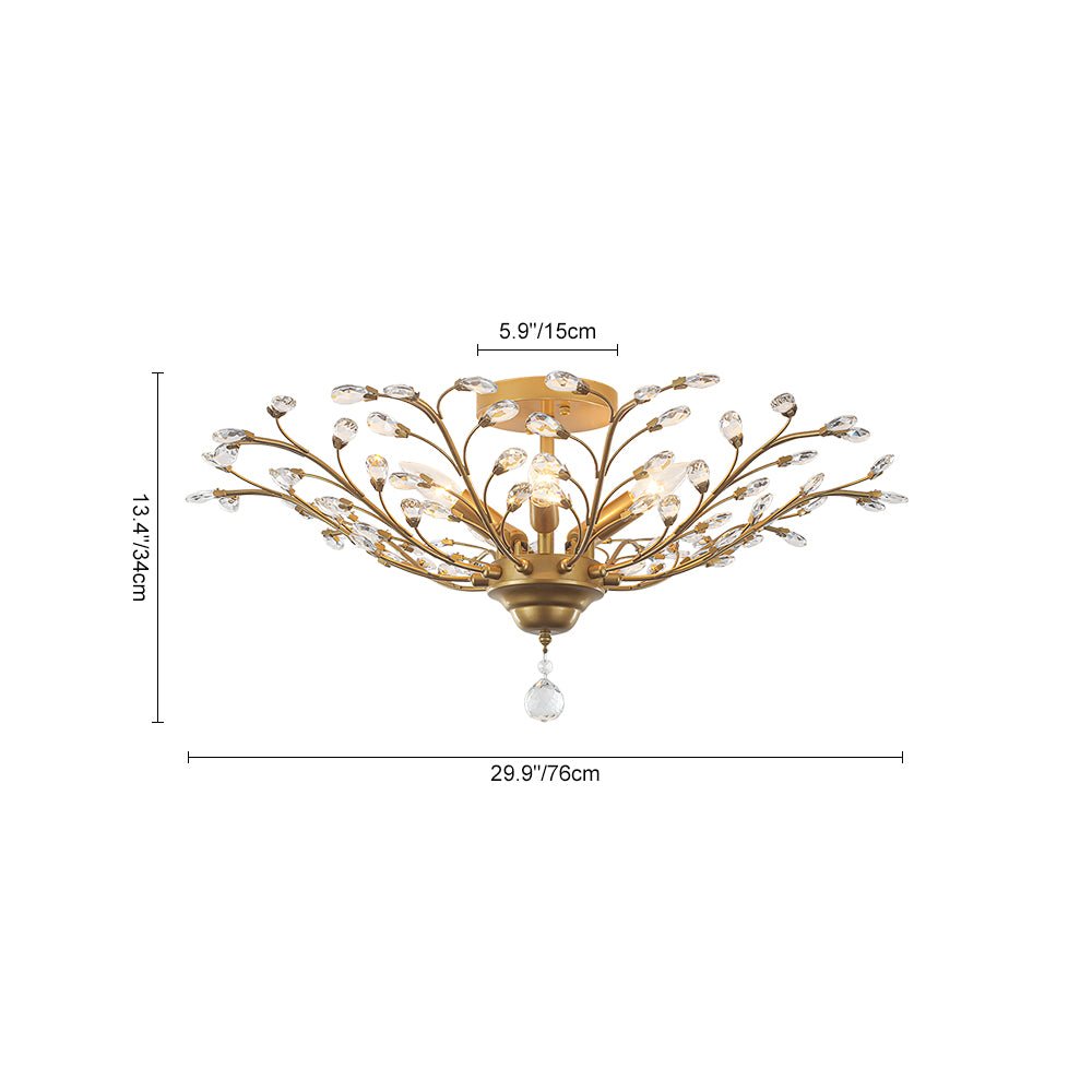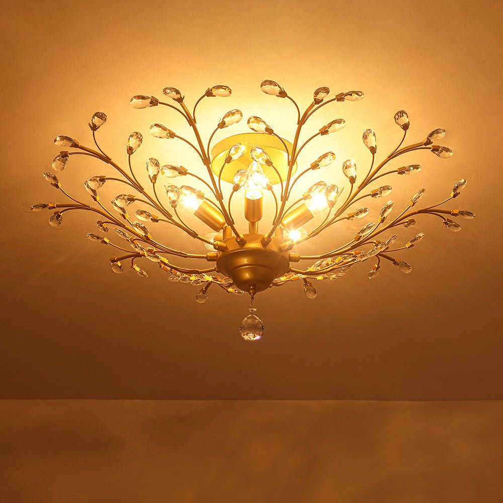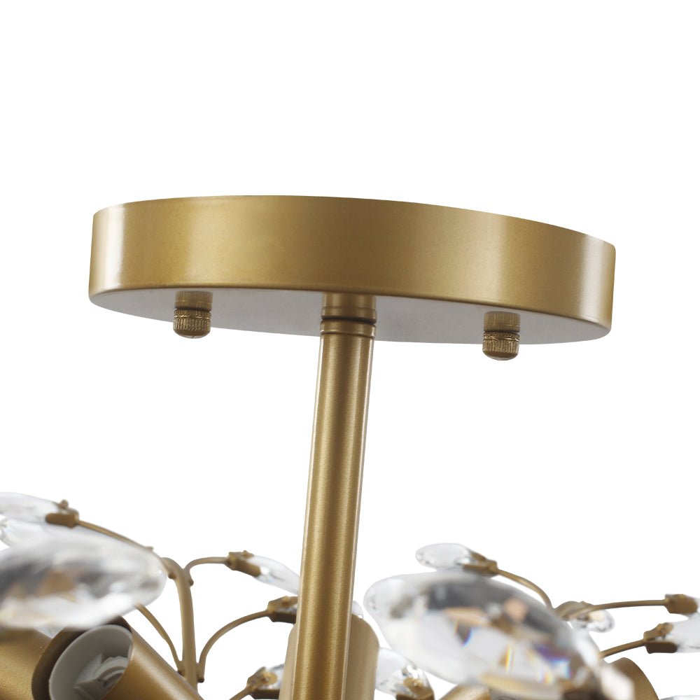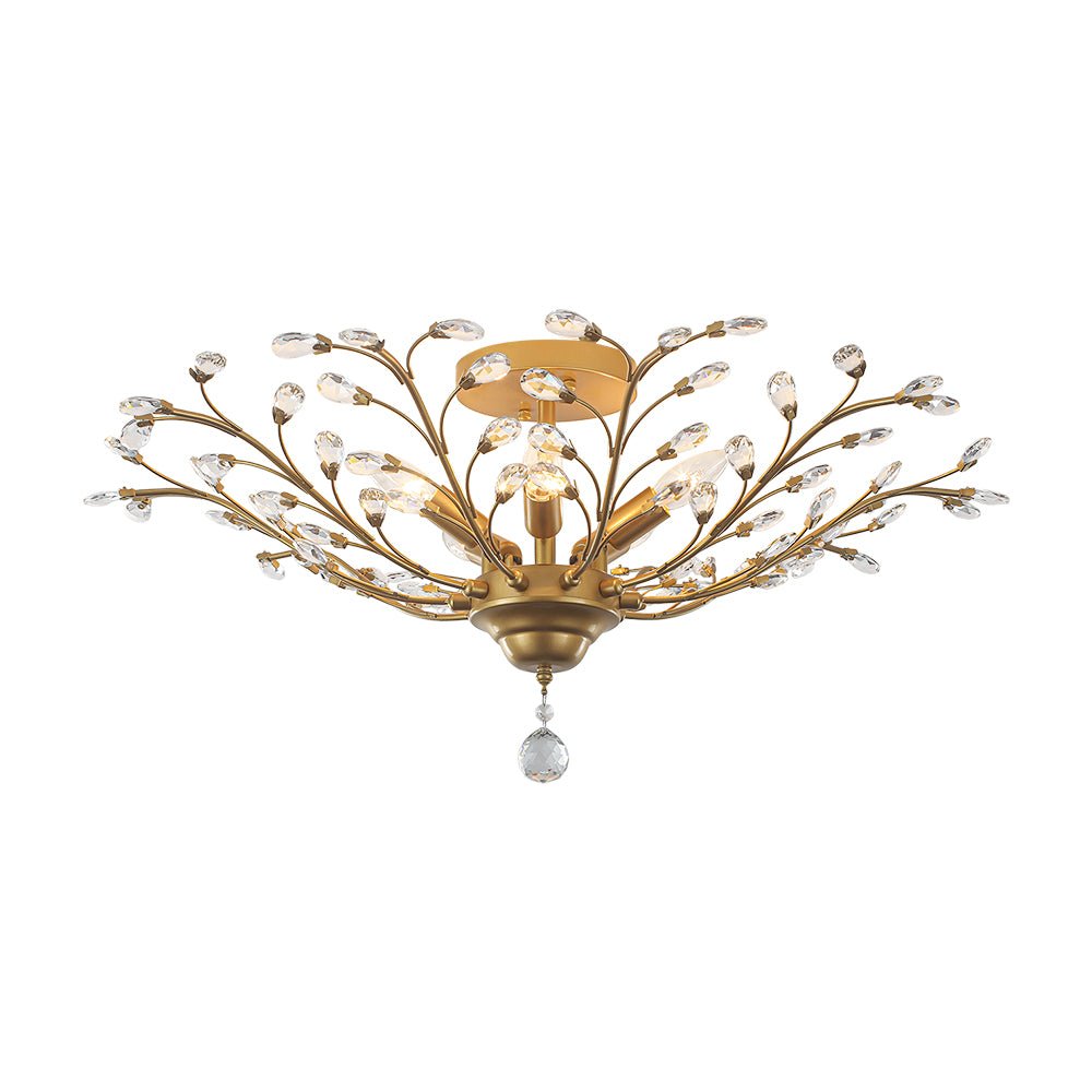 Combining vintage elegance with modern romance, this Art Deco 5-light flower basket crystal semi flush mount ceiling light infuses any room with a luxurious yet organic atmosphere, perfectly suited for spaces that aspire to a refined, artistic, romantic, glamorous, or retro aesthetic. Boasting a radial, floral-like silhouette, the chandelier is meticulously crafted from high-quality iron, which features a durable painted finish and comes in two elegant options: spray-painted gold or matte black. The curved branches extend outward in all directions, shaping a full and dynamic outline, while the crystal ornaments, which resemble dewdrops or budding flowers, and lamp holders are embedded among these branches, rendering the overall form both naturally evocative and artistically sophisticated. It serves as an ideal lighting fixture for a dining area, restaurant, living room, bedroom, foyer, lounge space, or boutique hotel, where it can elevate the ambiance with its unique blend of vintage charm and contemporary allure.