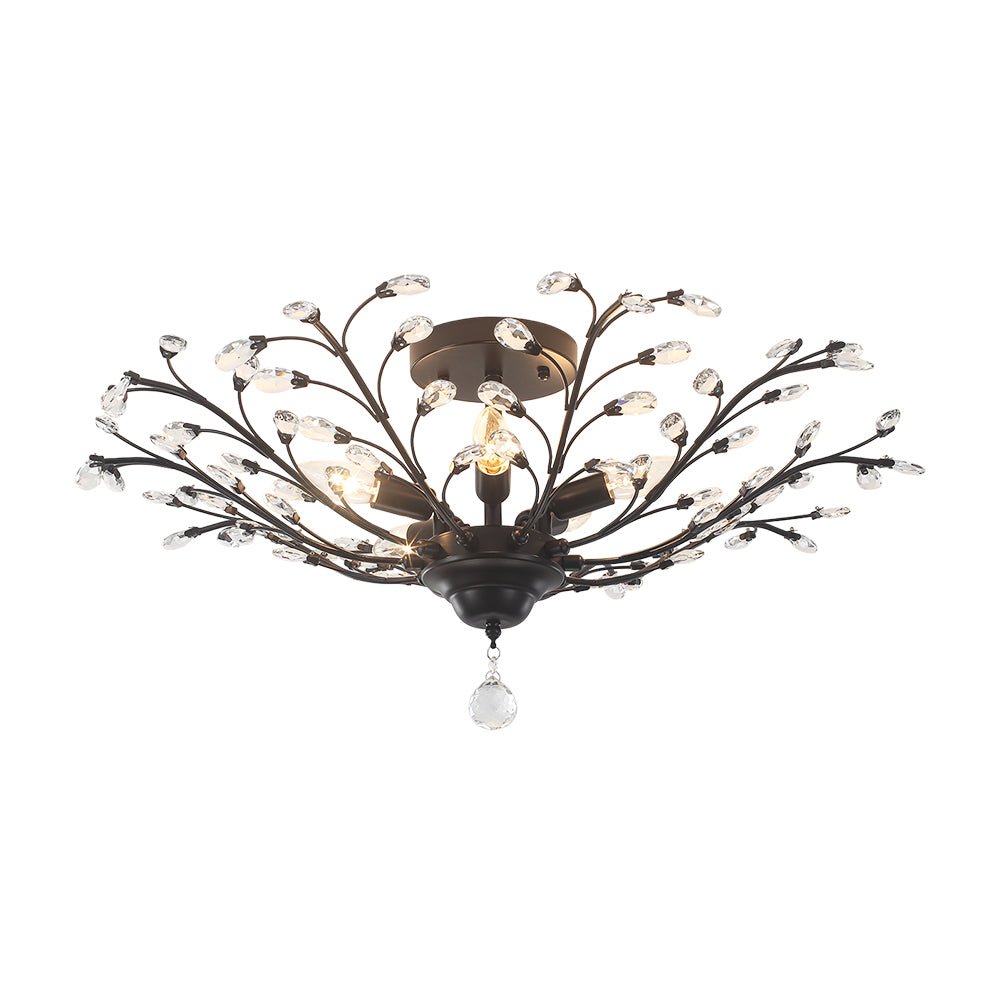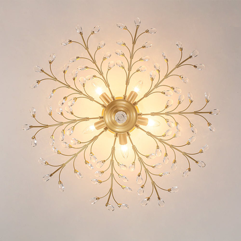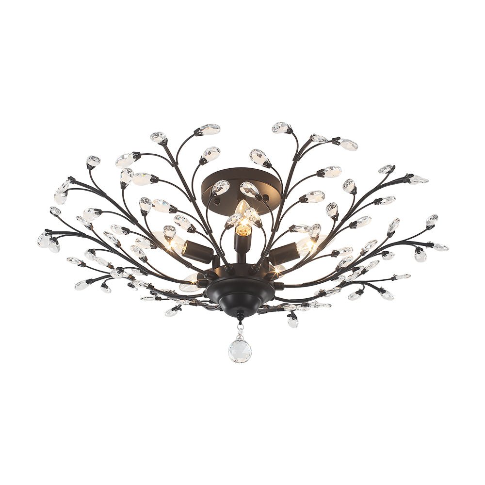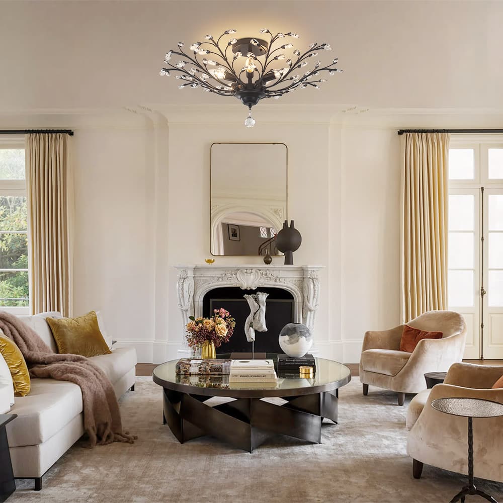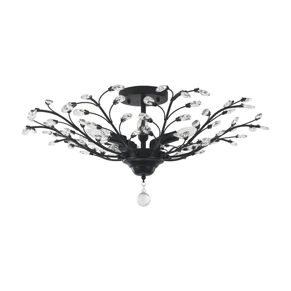 Combining vintage elegance with modern romance, this Art Deco 5-light flower basket crystal semi flush mount ceiling light infuses any room with a luxurious yet organic atmosphere, perfectly suited for spaces that aspire to a refined, artistic, romantic, glamorous, or retro aesthetic. Boasting a radial, floral-like silhouette, the chandelier is meticulously crafted from high-quality iron, which features a durable painted finish and comes in two elegant options: spray-painted gold or matte black. The curved branches extend outward in all directions, shaping a full and dynamic outline, while the crystal ornaments, which resemble dewdrops or budding flowers, and lamp holders are embedded among these branches, rendering the overall form both naturally evocative and artistically sophisticated. It serves as an ideal lighting fixture for a dining area, restaurant, living room, bedroom, foyer, lounge space, or boutique hotel, where it can elevate the ambiance with its unique blend of vintage charm and contemporary allure.