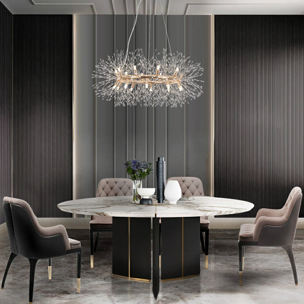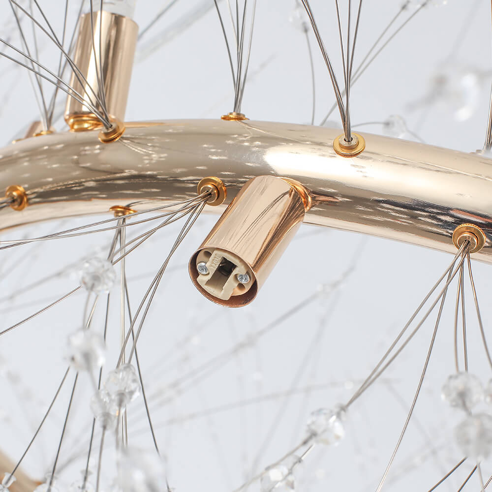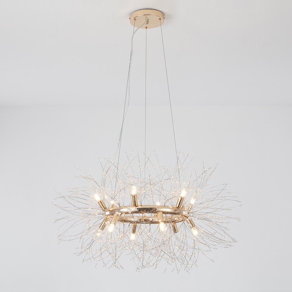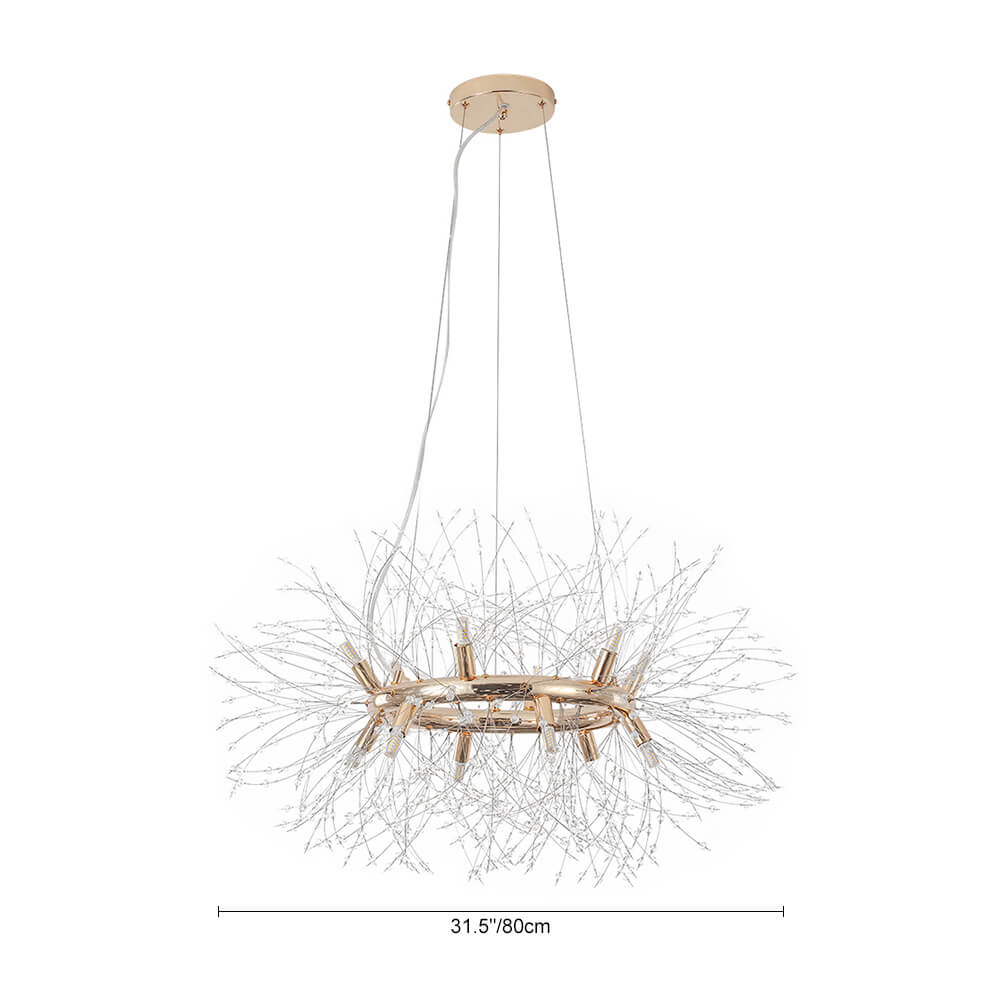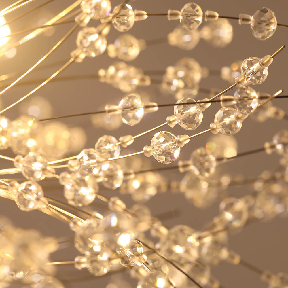 Illuminate your space with a radiant burst of elegance. This crystal firework chandelier features a warm brass-finish frame and a dynamic dandelion-inspired silhouette. Hundreds of intricately arranged crystals catch and reflect light from every angle, creating a shimmering explosion reminiscent of fireworks frozen in time. Ideal for kitchen islands, dining rooms, living areas, or bedrooms, its nature-inspired form brings both modern sophistication and organic beauty to any interior.
