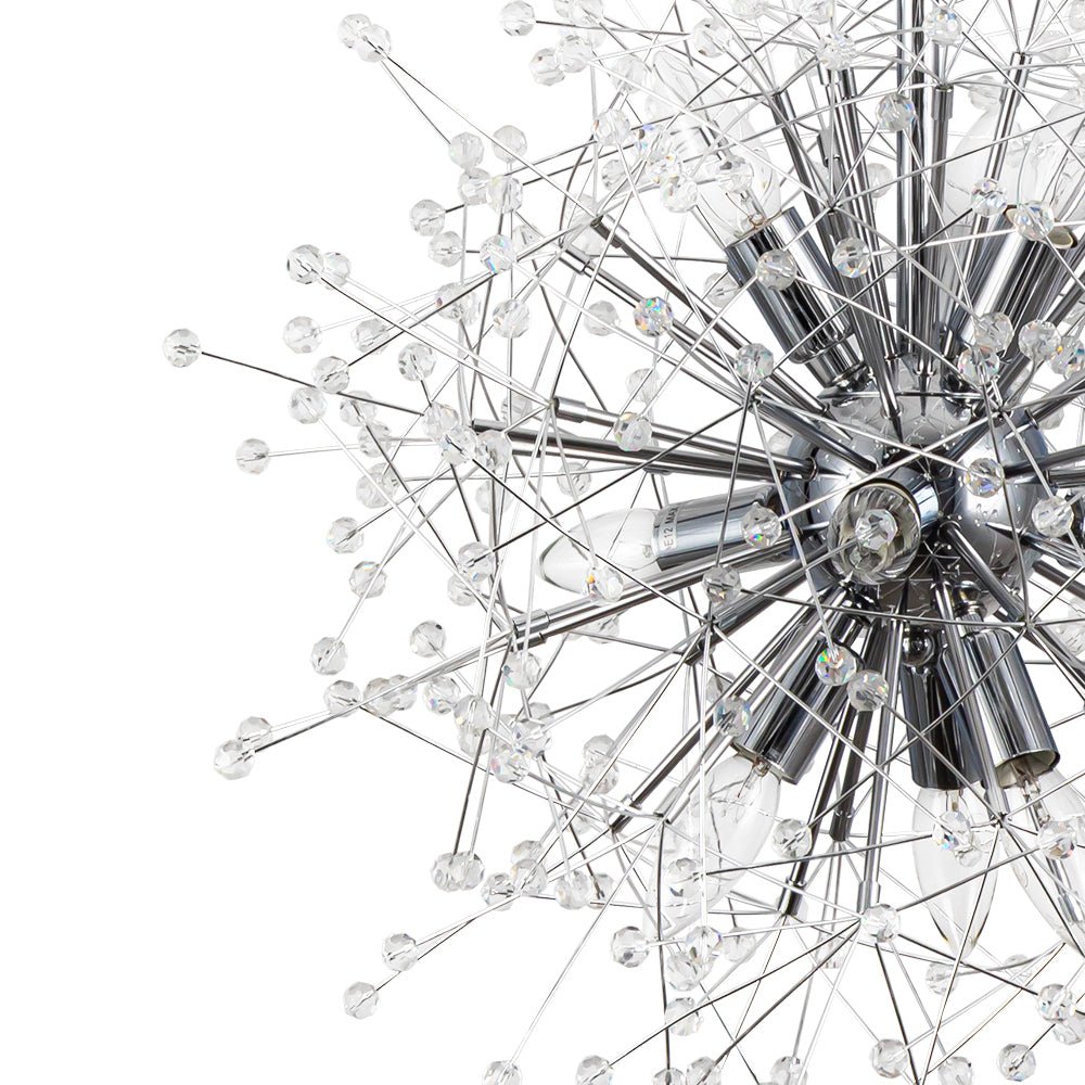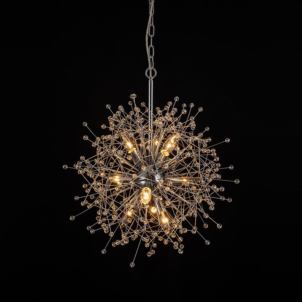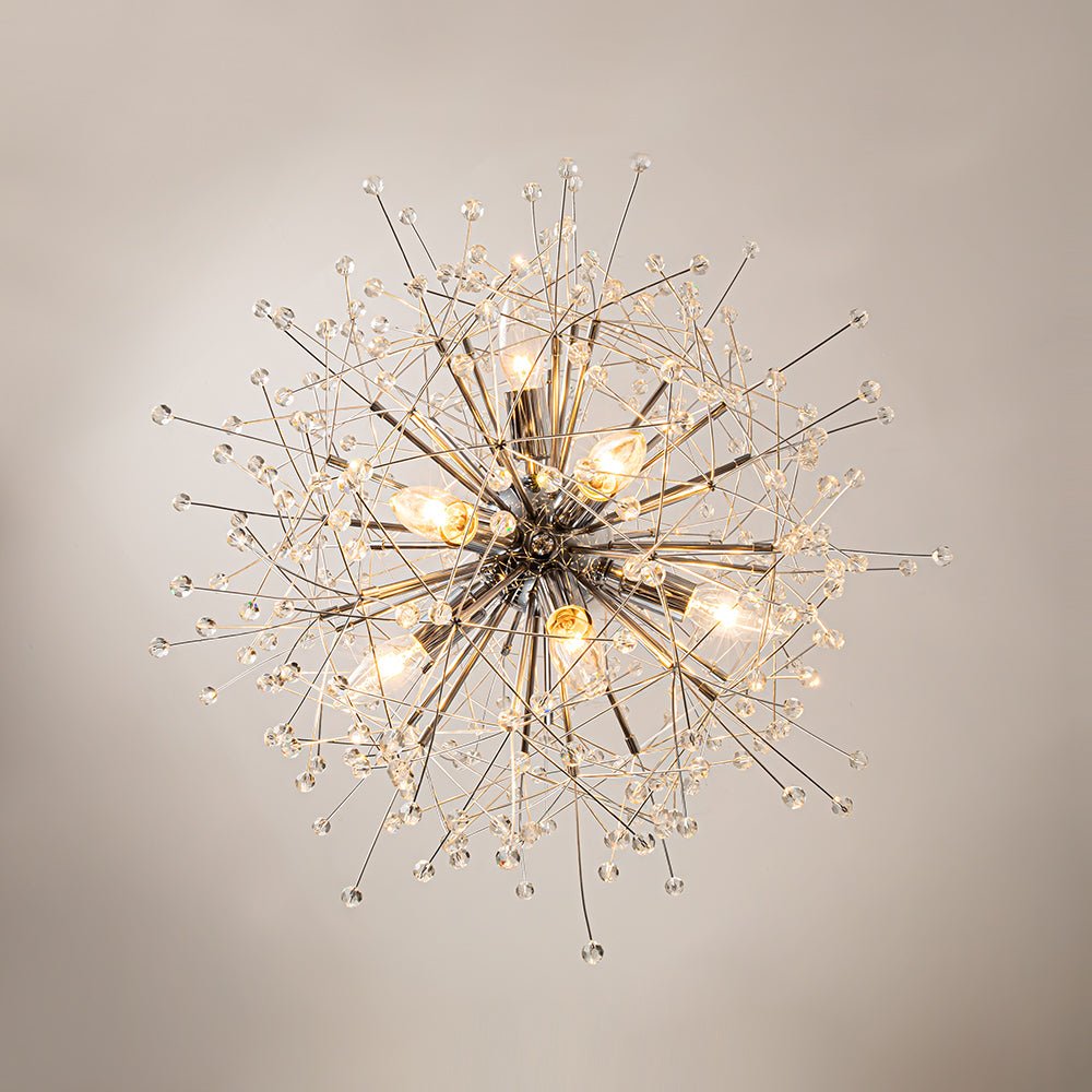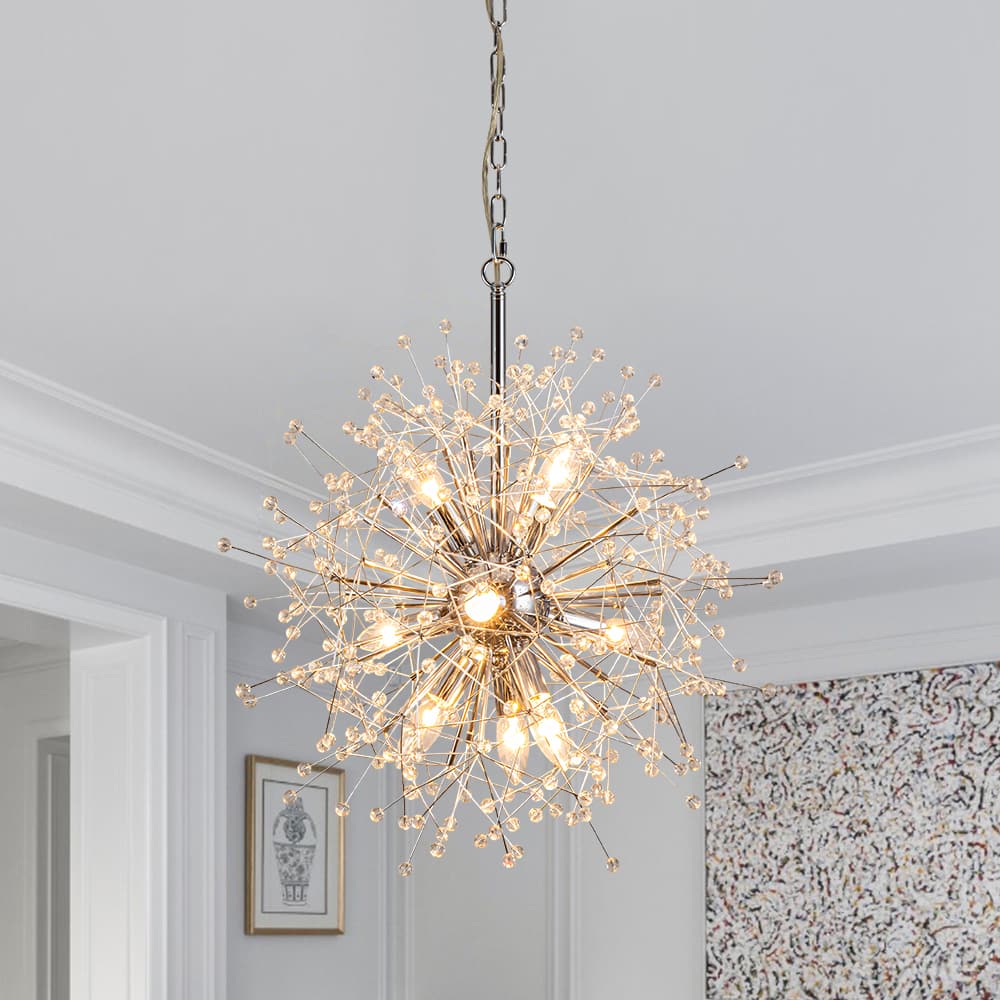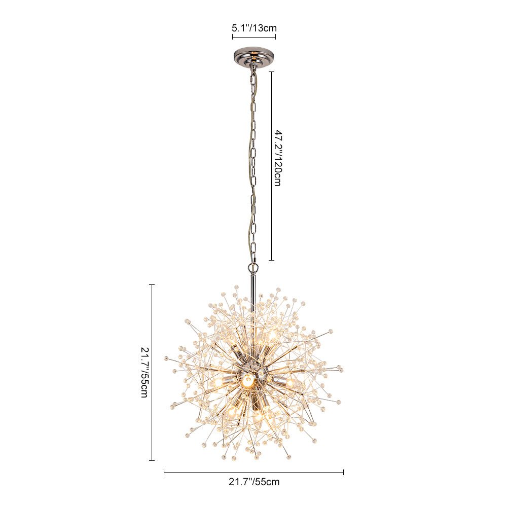 Drawing inspiration from a blooming dandelion, this 9-light firework sputnik crystal glass chandelier creates a spatial style that combines a futuristic and artistic atmosphere, suitable for various home and commercial spaces, including modern light luxury, retro, contemporary, art-deco, or glamorous interiors. When lit, the crystal bead flowers diffuse and refract light, forming a brilliant light-and-shadow effect like glowing dandelion florets. Crafted with chrome-finished metal, this starburst chandelier has a mirror-smooth surface and excellent anti-oxidation and anti-corrosion properties. Ideal for dining rooms, living areas, bedrooms, art galleries, and internet celebrity Cafes.