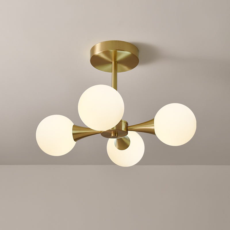Verleihen Sie Ihrem Interieur mit dieser klassischen Sputnik-Deckenleuchte einen Hauch von Glanz. Die halbaufgesetzte Leuchte mit vier Armen und vier Glasschirmen besticht durch ihr Messinggehäuse und bringt mit ihren klaren Linien und der hochwertigen Verarbeitung den Glamour der Mid-Century-Moderne in Ihr Esszimmer, Wohnzimmer, Schlafzimmer oder Ihren Eingangsbereich. Opalglas-Lampenschirme sorgen für elegante und stilvolle Akzente. Setzen Sie mit dieser halbaufgesetzten Deckenleuchte mit vier Glaskugeln stilvolle Akzente in Ihrem Zuhause.